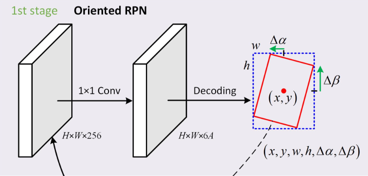 여기서 \((\x,\y)\)는 제안된 Proposal의 중심값이고, \(w\)와 \(h\)는 제안된 직사각형 박스의 Width와 Height입니다. \(\Delta\alpha\)와 \(\Delta\beta\)는 제안된 직사각형 박스의 윗변과 오른쪽변의 정중앙으로부터의 Offset을 나타냅니다. 정리하자면, 우리는 이를 통해 물체의 방향이 제안된 Oriented proposal값 \((x,y,w,h,\Delta\alpha,\Delta\beta)\)을 얻었습니다.