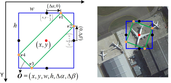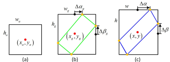 여기서 \((x_g,y_g)\), \((w_g, h_g)\)는 직사각형의 중간좌표, width, height를 나타냅니다. \(\Delta\alpha_g\)와 \(\Delta\beta_g\)는 윗쪽 변과 오른쪽 변의 정중앙 좌표로부터의 거리를 나타냅니다.