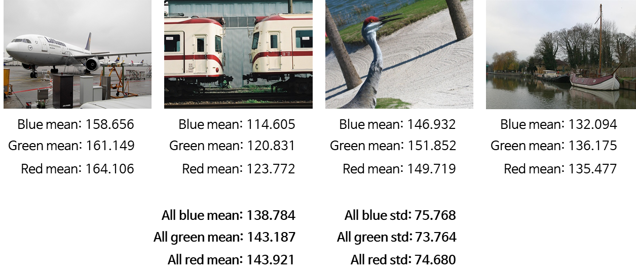 위와 같은 방법으로 한 장의 이미지에서 각 성분값의 평균을 계산하는 방법을 설명드렸습니다. 이번에는 학습 데이터셋에 있는 모든 이미지의 성분별 평균을 구해봅니다. 아래와 같이 전체 학습 데이터셋 이미지가 4장이라고 가정하였을 때, 각 이미지별 BGR 평균을 구한 다음, 각 성분별 전체 이미지 데이터셋의 평균과 표준편차를 구합니다.