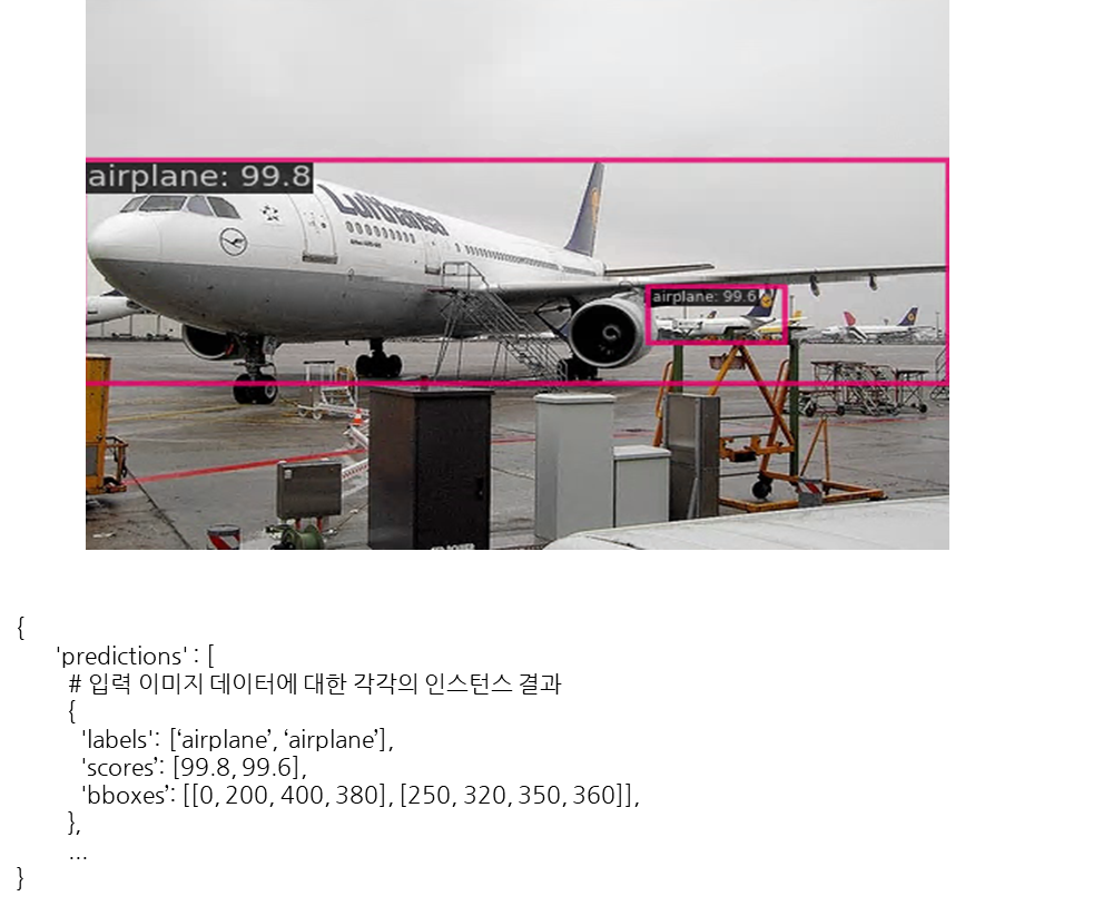 Object Detection 방식의 경우 입력된 이미지에서 해당 물체가 이미지의 어느 위치에 있는지 네모(Bounding Box)로 직접 표시되며, 결과값은 각 label의 class속성과 신뢰도(score), 네모의 좌표값(예제의 경우 네모의 왼쪽위 꼭지점과 오른쪽아래 꼭지점의 좌표)를 출력합니다. 아래의 예제는 결과값을 json 양식으로 나타냅니다.