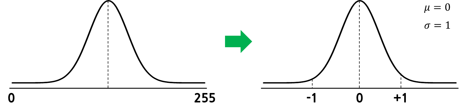 앞에서 언급하였던 데이터 전처리는 데이터셋 내부의 이미지들간의 값의 격차로 인한 AI학습의 성능저하를 줄이기 위해 데이터셋의 일반화(Normalization)과정을 거치게 됩니다. 아래와 같이 이미지 특정 채널 성분의 평균값이 0과 255로 극단적으로 떨어진 두 값이 일반화(Normalization) 과정을 거쳐 평균 0에 표준편차가 1인 정규분포로 변환되며, 양단의 극값의 격차를 최소한으로 줄여 AI모델이 편향을 최소화하고 정규분포 내에 속한 대다수의 데이터들을 고르게 학습하여 좋은 성능의 AI모델을 만들 수 있게됩니다.