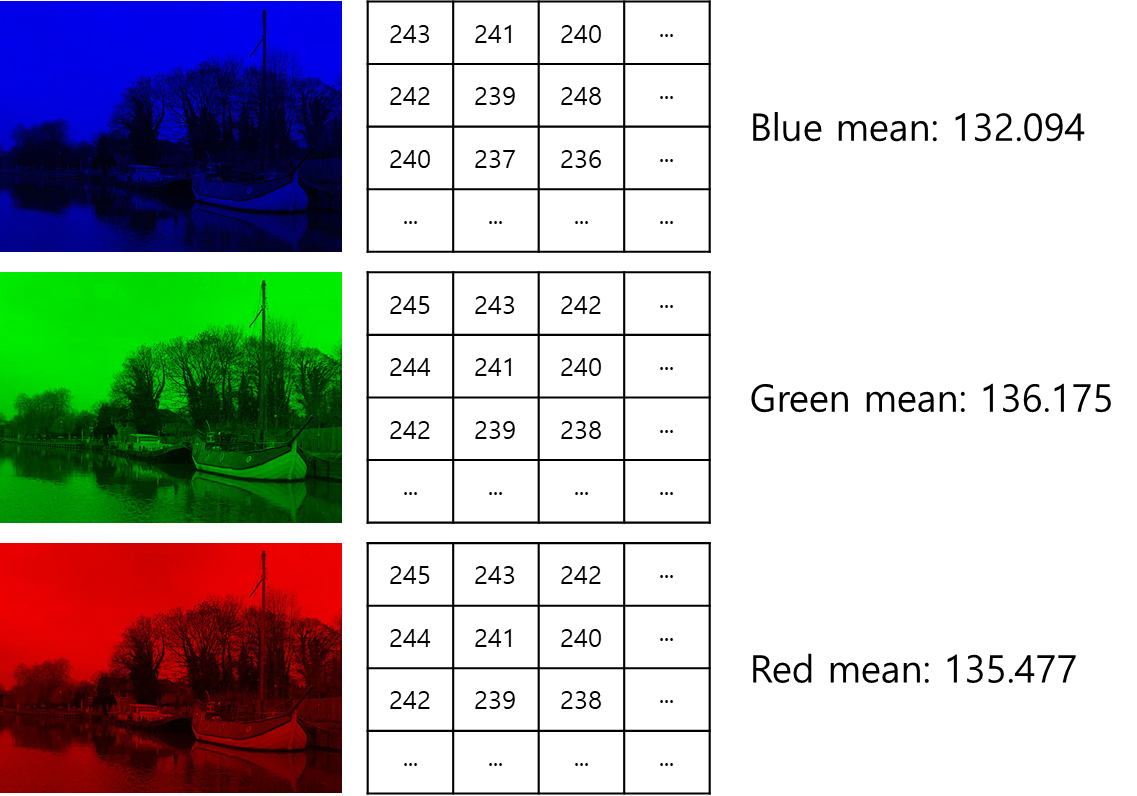 지금부터는 이미지 데이터를 정규분포화 하여 전처리를 수행하는 방법을 설명드리도록 하겠습니다. 앞서 말씀드린 바와 같이 한 장의 이미지에서 빛의 삼원색별 성분을 각각 분리한 후 각 성분별 픽셀의 성분값을 전부 합한 값에 전체 픽셀수를 나누어 파란색, 녹색, 빨간색 성분의 평균값을 구합니다.