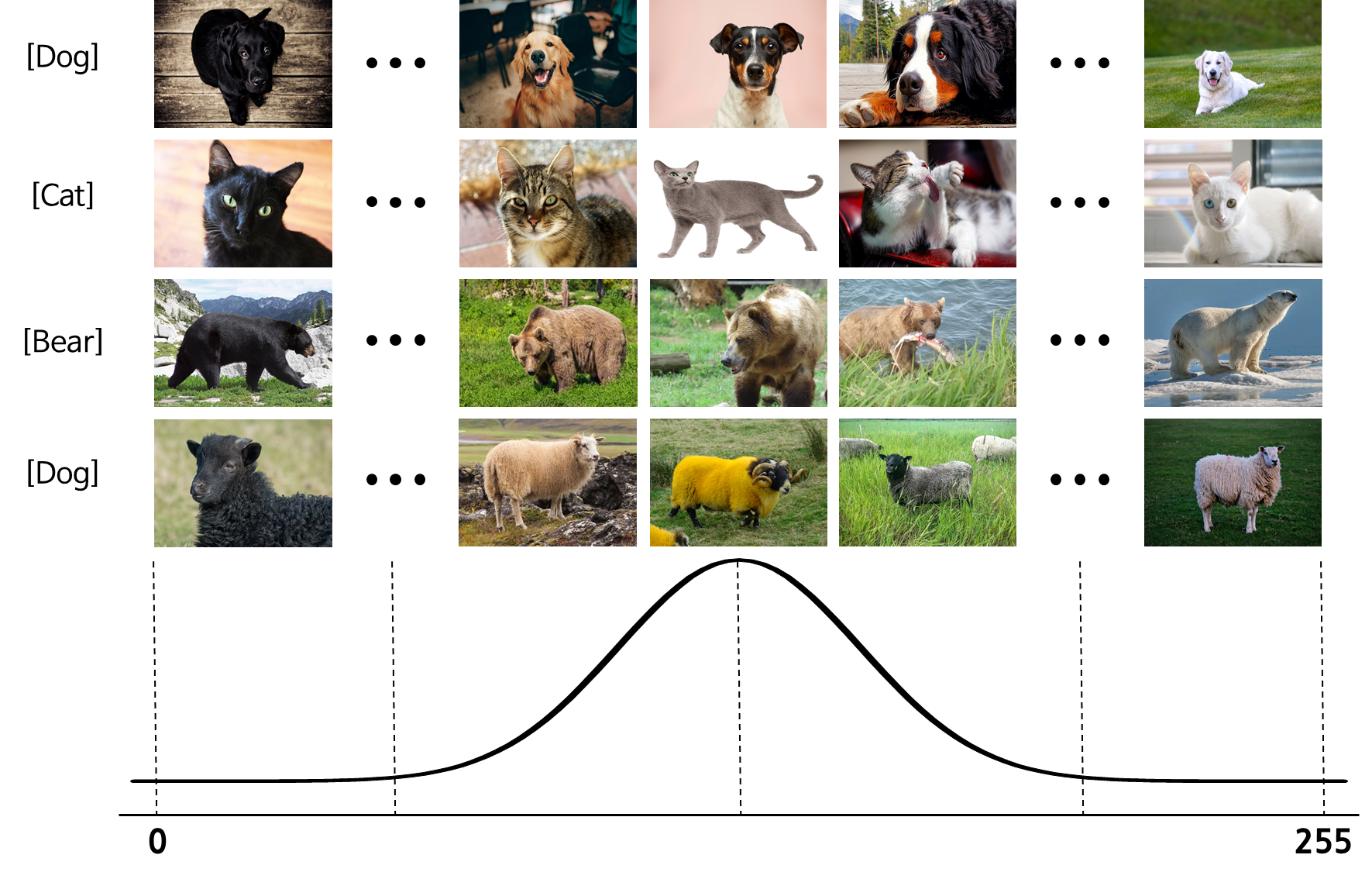 위의 그림에서 보듯이 털색이 검은색인 동물의 이미지는 RGB 평균값이 0에 가깝고, 흰색인 동물의 경우 RGB 평균값이 255에 가까울 것입니다. 만약 이러한 데이터셋이 어떠한 가공 없이 AI모델의 입력값으로 들어가 학습되면 두 입력값의 차이가 상당히 커 AI모델의 Weight값의 변동이 커지게 되고 이는 학습이 원활하게 되지 않게 하는 요인이 되어 최종 학습 결과가 좋지 못할 수 있습니다. 가령, 이러한 데이터로 학습된 AI모델이 털색이 검은색인 동물과 흰색인 동물은 분류가 잘 되지만, RGB 평균값이 중간값에 분포된 다수의 데이터들은 분별이 잘 되지 않을 수 있습니다.