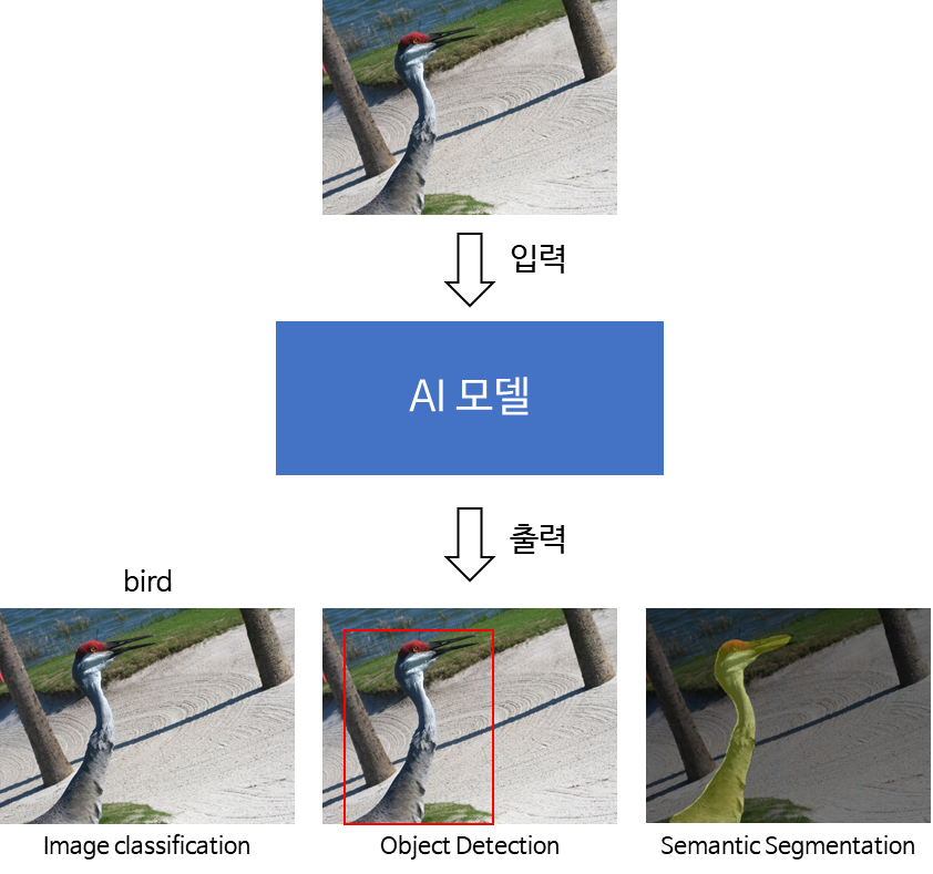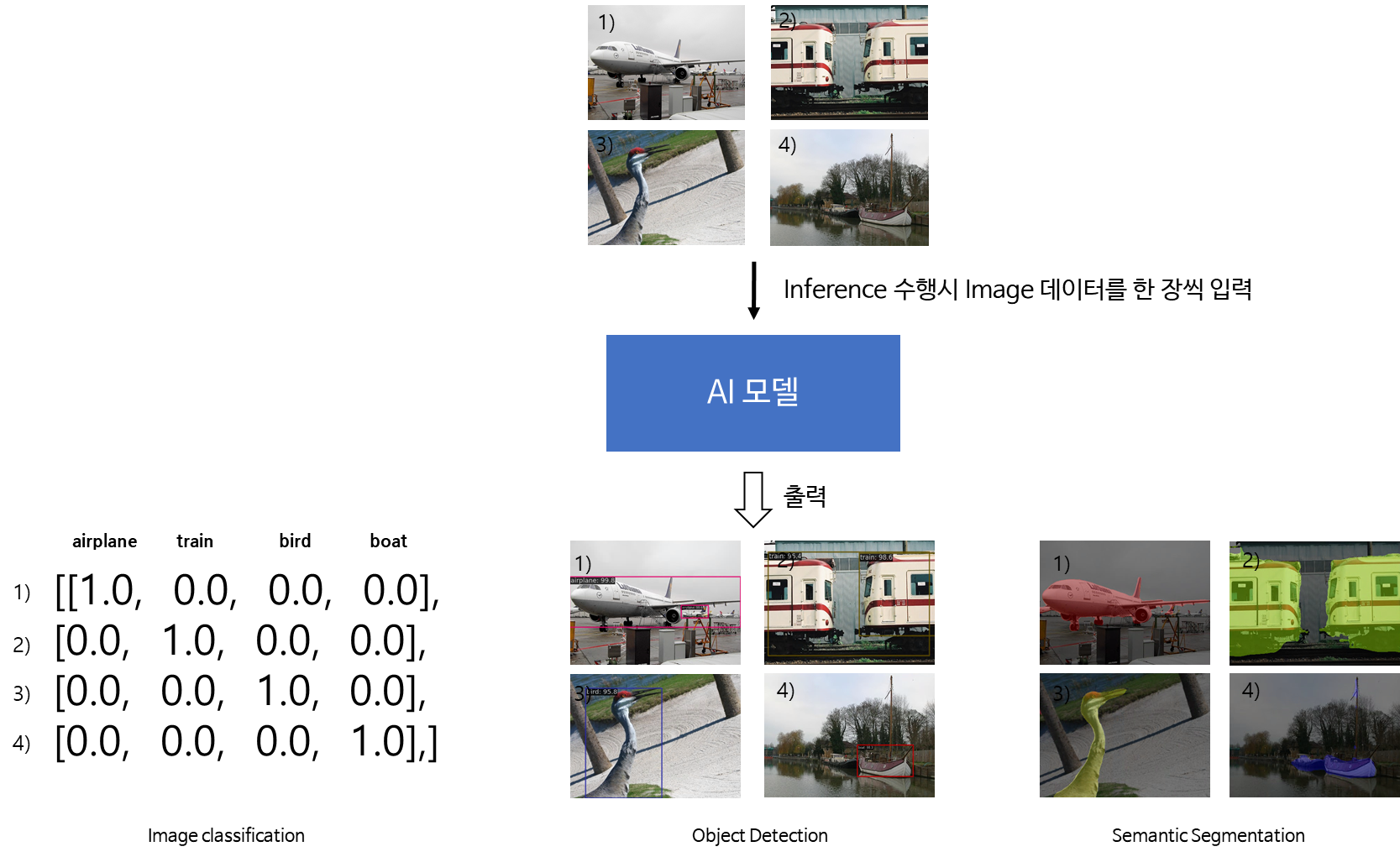 보편적인 Vision AI모델은 한 장의 이미지가 AI모델에 입력되면 이미지의 정보를 추론한 결과를 출력합니다. 이미지의 전반적인 특성을 하나의 Class로 나타내는 Image Classification, 이미지 내에서 해당 특성의 위치를 네모로 표시해 나타내는 Object Detection, 이미지 내의 해당 특성을 픽셀로 직접 표현하는 Semantic Segmentation이 있습니다. 자신이 개발하는 AI모델이 적용되는 도메인에 따라 각 종류의 Inference 결과중 가장 적합한 방법을 선택하면 됩니다.