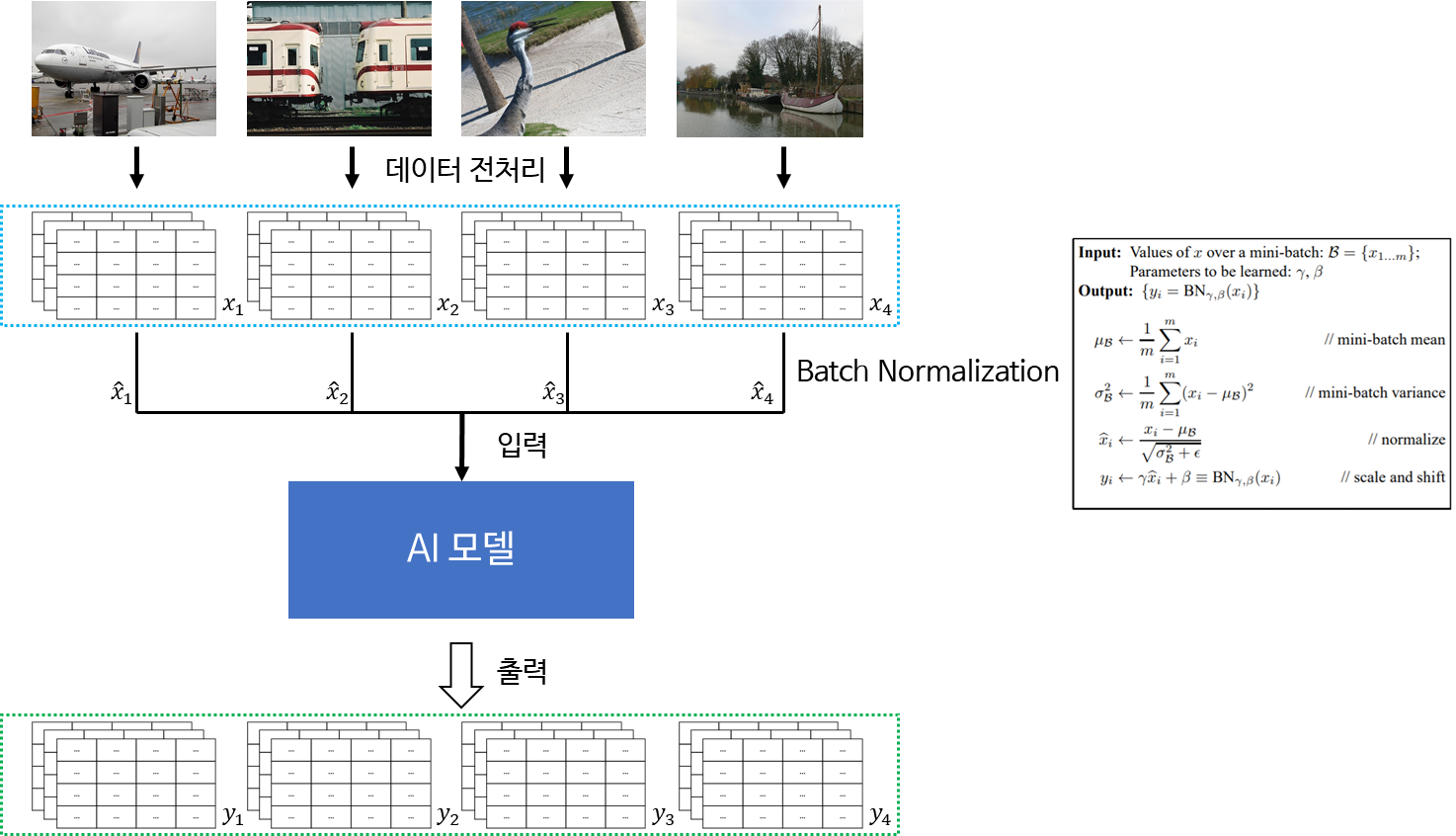 1회의 Batch의 데이터가 AI모델에 입력되지 전 Batch Normalization을 거쳐 한 번더 가공되어 AI모델에 입력됩니다. 출력 이미지는 Batch의 크기와 같으며, 각 이미지와 Ground Truth와 비교하여 Loss값이 최소로 되도록 AI모델을 학습시킵니다.