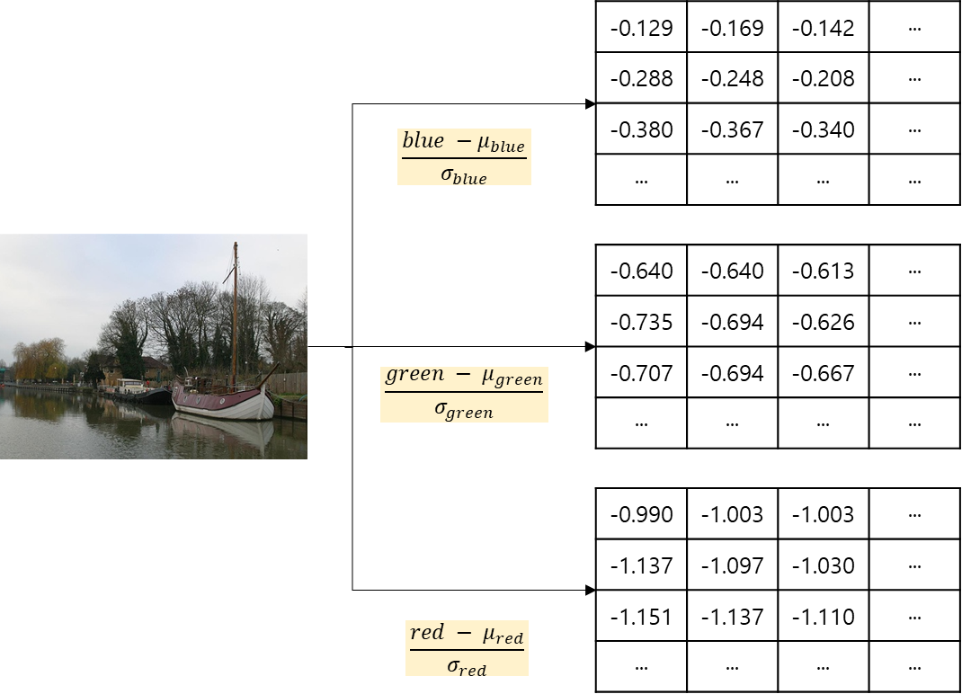 이제 우리는 데이터셋에 있는 모든 이미지 데이터의 성분별 평균과 표준편차를 구하였습니다. 위 값을 사용해 이미지들을 아래와 같은 방법으로 전처리를 하여 AI모델의 입력 데이터로 변환할 수 있습니다.