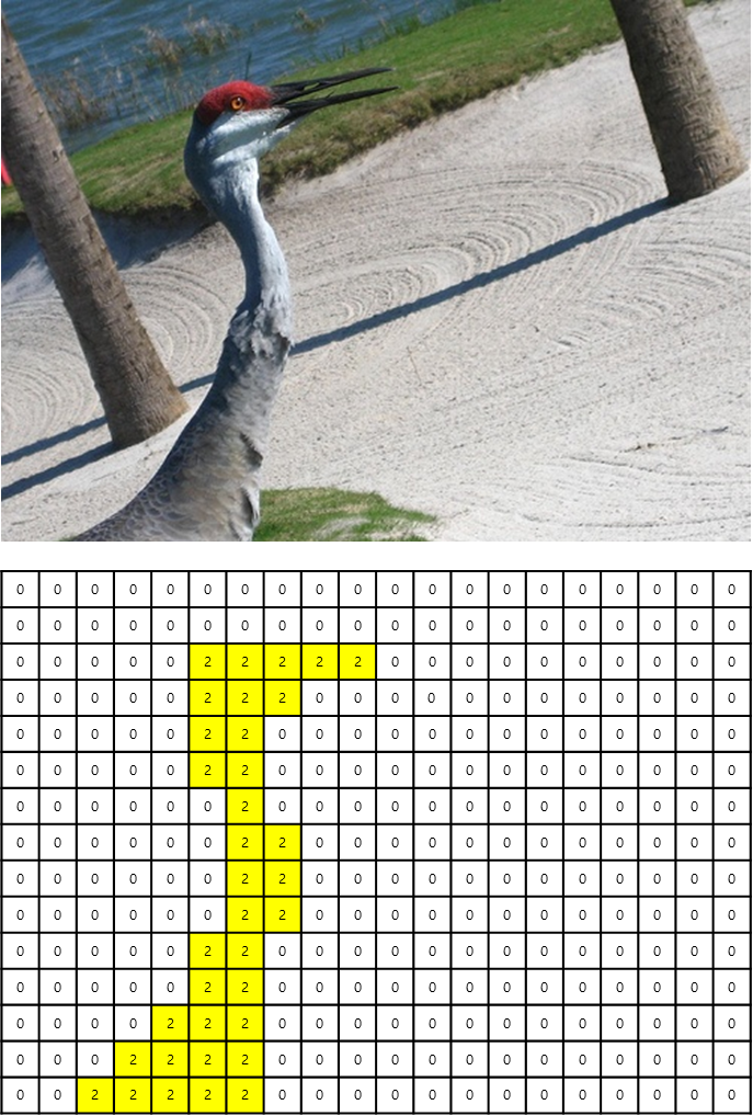 Semantic Segmentation은 이미지의 실제 픽셀 위치에 label class값을 표시하는 것으로 아래의 예제에서 배경은 0, 새에 해당되는 부분을 2로 나타낸 것입니다.