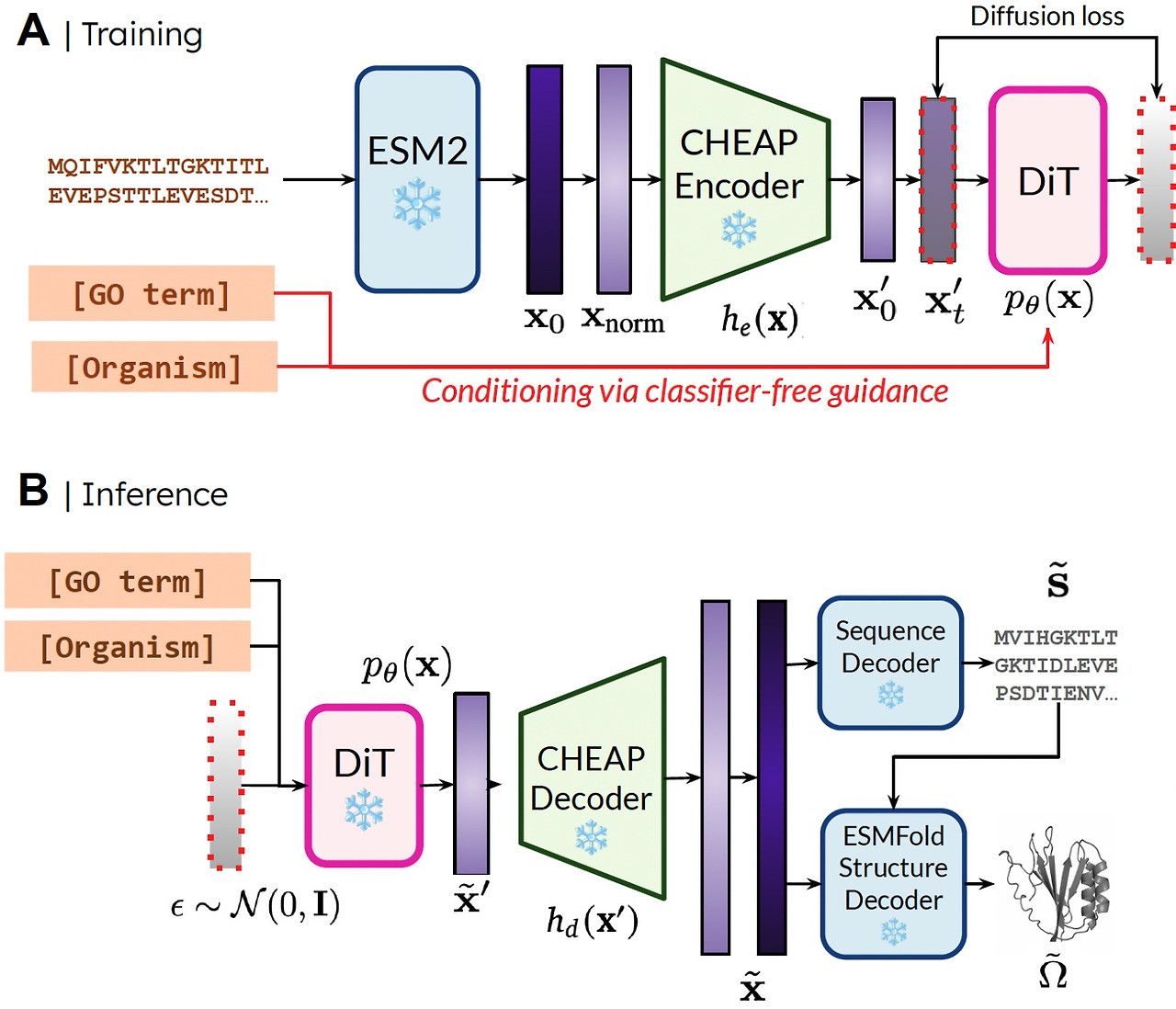 PLAID에서는 단백질 접힘 모델의 잠재 공간에서 샘플링을 학습하여 새로운 단백질을 생성하는 방법을 개발합니다. 구성 기능과 유기체 프롬프트를 수용할 수 있으며 구조 데이터베이스보다 2~4배 더 큰 서열 데이터베이스로 학습할 수 있습니다. 이전의 많은 단백질 구조 생성 모델과 달리 PLAID는 이산 서열과 연속적인 전체 원자 구조 좌표를 동시에 생성하는 멀티모달 공동 생성 문제 설정을 해결할 수 있습니다.