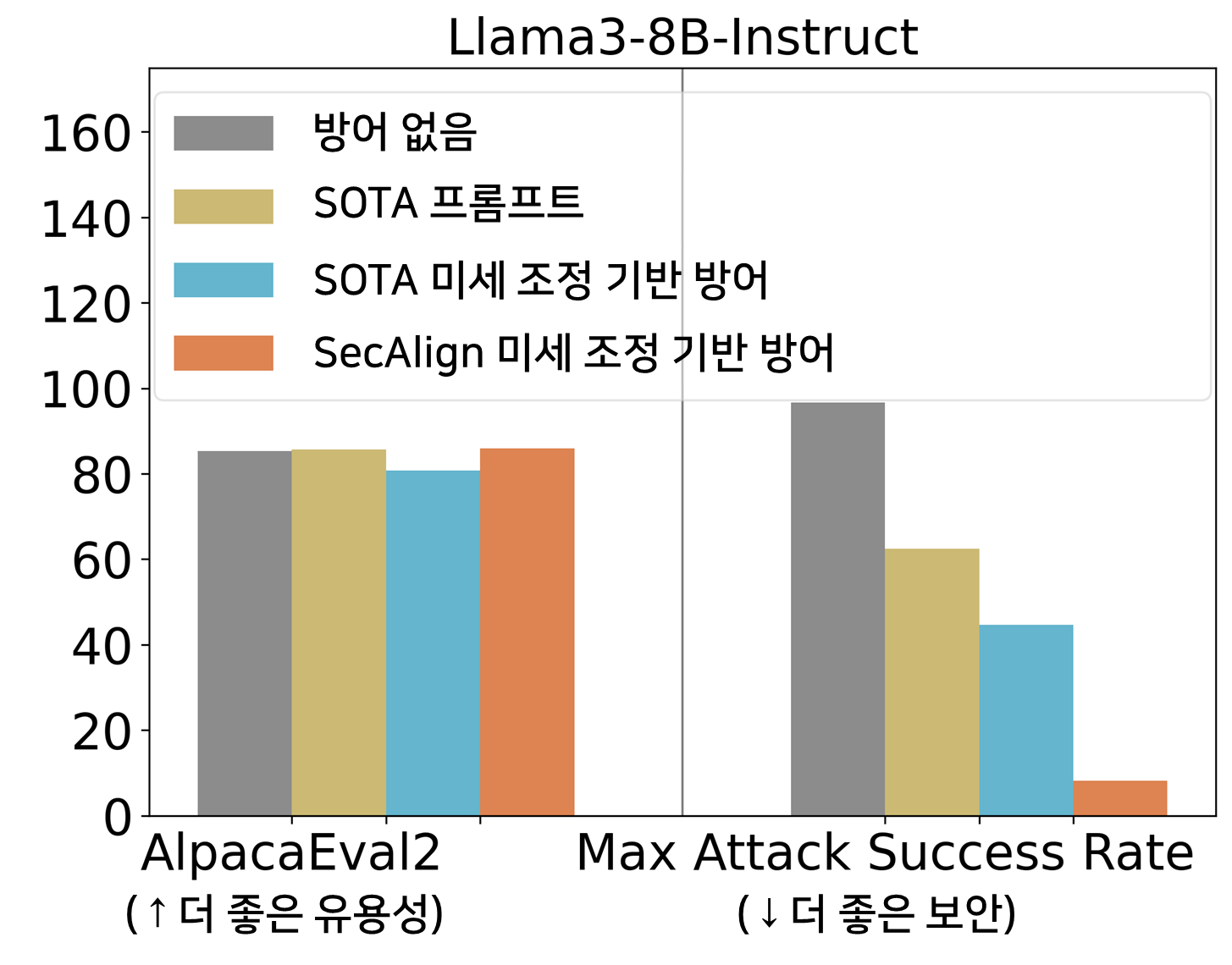 또한 방어 훈련 후 모델의 범용 유용성을 평가하기 위해 AlpacaEval2를 사용합니다. Llama3-8B-Instruct에서 SecAlign은 AlpacaEval2 점수를 보존하고 StruQ는 4.5% 감소시켰습니다.