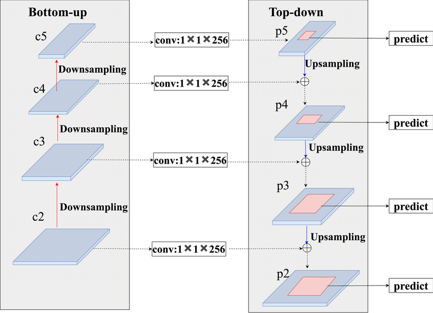 사진 내에 있는 다양한 크기의 물체들을 볼 수 있게 하는 멀티스케일 방법 중 하나인 FPN 기술은 위의 그림과 같이 아래쪽 층에서는 세밀한 부분을 잘 볼 수 있으며, 위로 갈 수록 이미지의 전체적인 모습을 잘 볼 수 있게 해줍니다. 위에서 아래로 이미지의 정보를 전달 하고 옆으로 연결하여 여러 층의 정보를 합치면 작은 물체와 큰 물체의 정보를 동시에 인식할 수 있게 됩니다.